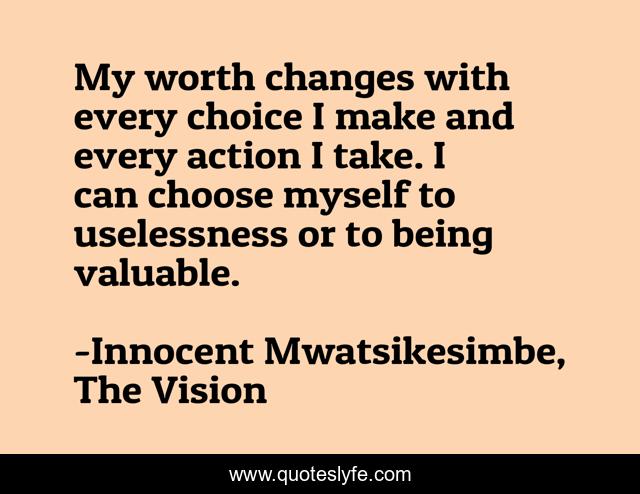 This page presents the quote "My worth changes with every choice I make and every action I take. I can choose myself to uselessness or to being valuable.". Author of this quote is Innocent Mwatsikesimbe, The Vision. This quote is about destiny, value, self-worth, self-improvement, inspirational, enthusiasm, choices,.