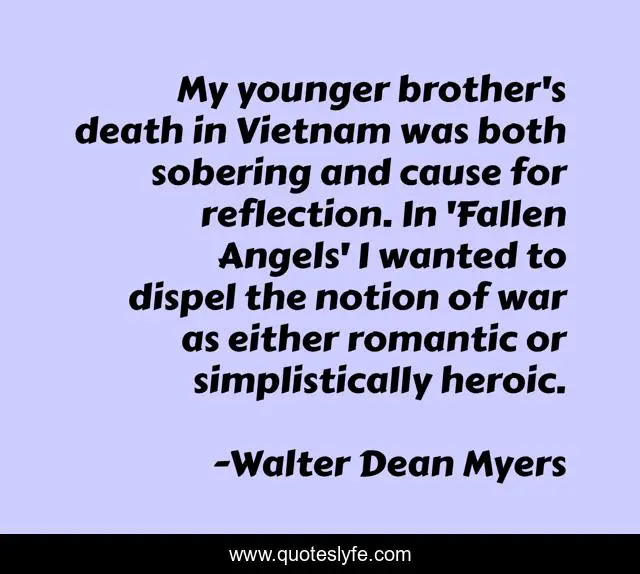 This page presents the quote "My younger brother's death in Vietnam was both sobering and cause for reflection. In 'Fallen Angels' I wanted to dispel the notion of war as either romantic or simplistically heroic.". Author of this quote is Walter Dean Myers. This quote is about death, reflection, brother,.