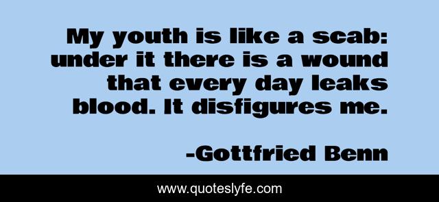 This page presents the quote "My youth is like a scab: under it there is a wound that every day leaks blood. It disfigures me.". Author of this quote is Gottfried Benn. This quote is about pain, the-past, memory,.