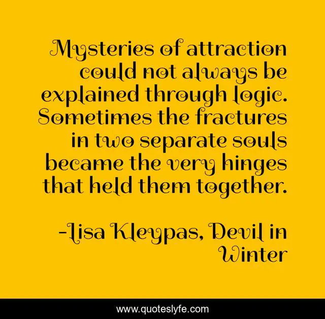 This page presents the quote "Mysteries of attraction could not always be explained through logic. Sometimes the fractures in two separate souls became the very hinges that held them together.". Author of this quote is Lisa Kleypas, Devil in Winter. This quote is about attraction, love, affection,.