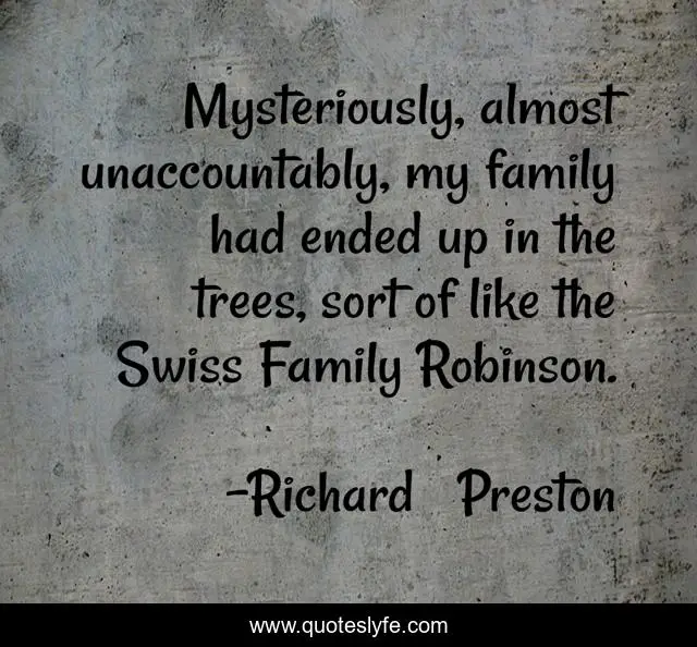 This page presents the quote "Mysteriously, almost unaccountably, my family had ended up in the trees, sort of like the Swiss Family Robinson.". Author of this quote is Richard Preston. This quote is about nature, redwoods, trees, forest,.