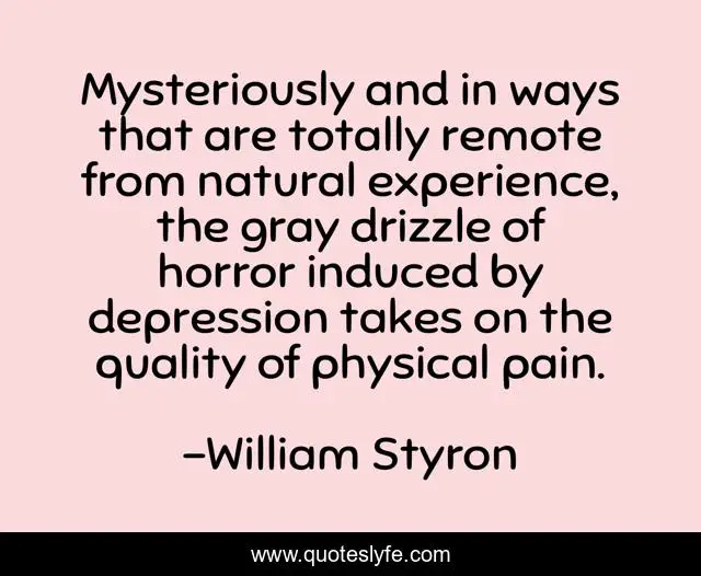 This page presents the quote "Mysteriously and in ways that are totally remote from natural experience, the gray drizzle of horror induced by depression takes on the quality of physical pain.". Author of this quote is William Styron. This quote is about pain, quality, depression,.