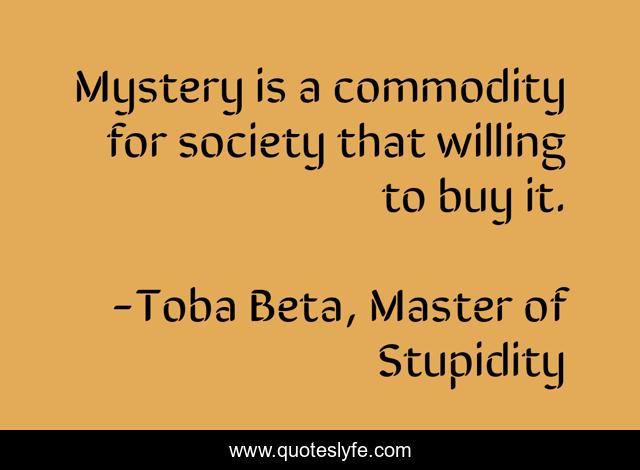 This page presents the quote "Mystery is a commodity for society that willing to buy it.". Author of this quote is Toba Beta, Master of Stupidity. This quote is about mystery, society, commodity,.