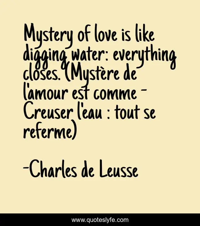 This page presents the quote "Mystery of love is like digging water: everything closes. (Mystère de l'amour est comme - Creuser l'eau : tout se referme)". Author of this quote is Charles de Leusse. This quote is about mystery, creuser, love, dig, water, mystère, amour, eau, affection,.