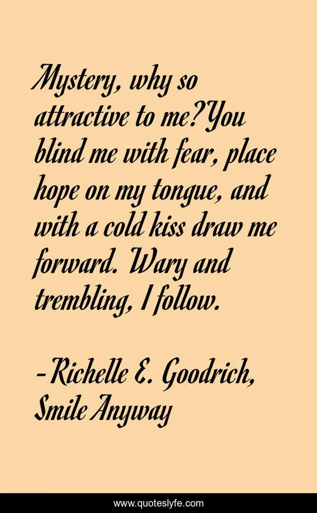 This page presents the quote "Mystery, why so attractive to me?You blind me with fear, place hope on my tongue, and with a cold kiss draw me forward. Wary and trembling, I follow.". Author of this quote is Richelle E. Goodrich, Smile Anyway. This quote is about mystery, wariness, attraction, richelle, richelle-goodrich, fear,.