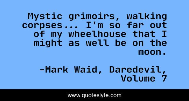 This page presents the quote "Mystic grimoirs, walking corpses... I'm so far out of my wheelhouse that I might as well be on the moon.". Author of this quote is Mark Waid, Daredevil, Volume 7. This quote is about daredevil, mysticism,.