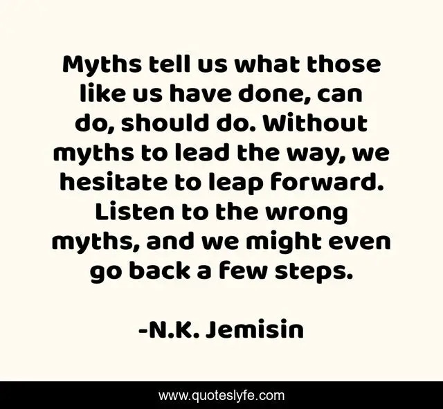 This page presents the quote "Myths tell us what those like us have done, can do, should do. Without myths to lead the way, we hesitate to leap forward. Listen to the wrong myths, and we might even go back a few steps.". Author of this quote is N.K. Jemisin. This quote is about myths, stories,.
