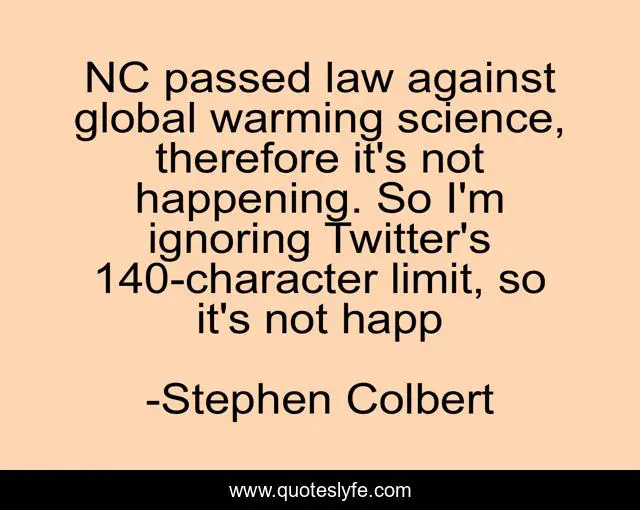 This page presents the quote "NC passed law against global warming science, therefore it's not happening. So I'm ignoring Twitter's 140-character limit, so it's not happ". Author of this quote is Stephen Colbert. This quote is about climate-change-denial, humour, global-warming, twitter, right-wing-politics, north-carolina, politics, law,.