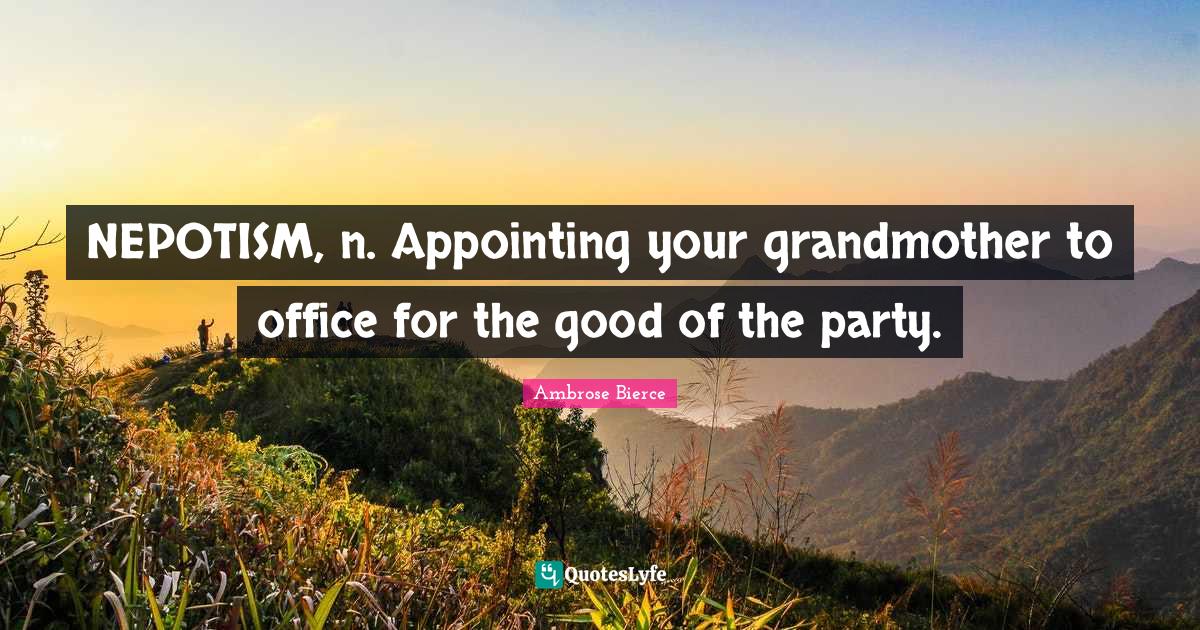 This page presents the quote "NEPOTISM, n. Appointing your grandmother to office for the good of the party.". Author of this quote is Ambrose Bierce. This quote is about party, your grandmother, nepotism, office, grandmother,.