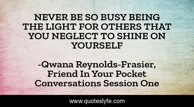 "Qwana Reynolds-Frasier, Friend In Your Pocket Conversations Session One Quotes." Quoteslyfe.com, 2025. Mon. 08 Dec. 2025. <https://www.quoteslyfe.com/quote/NEVER-BE-SO-BUSY-BEING-THE-LIGHT-77801>.