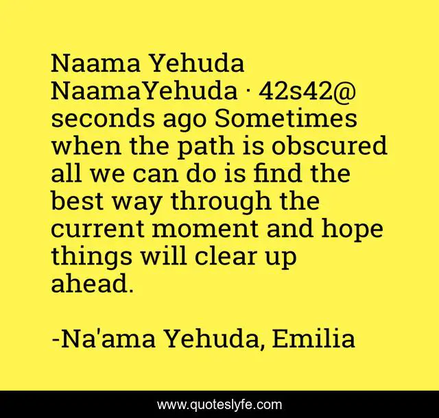 This page presents the quote "Naama Yehuda @NaamaYehuda · 42s42 seconds ago Sometimes when the path is obscured all we can do is find the best way through the current moment and hope things will clear up ahead.". Author of this quote is Na'ama Yehuda, Emilia. This quote is about quote, life-lessons, truth, wisdom,.