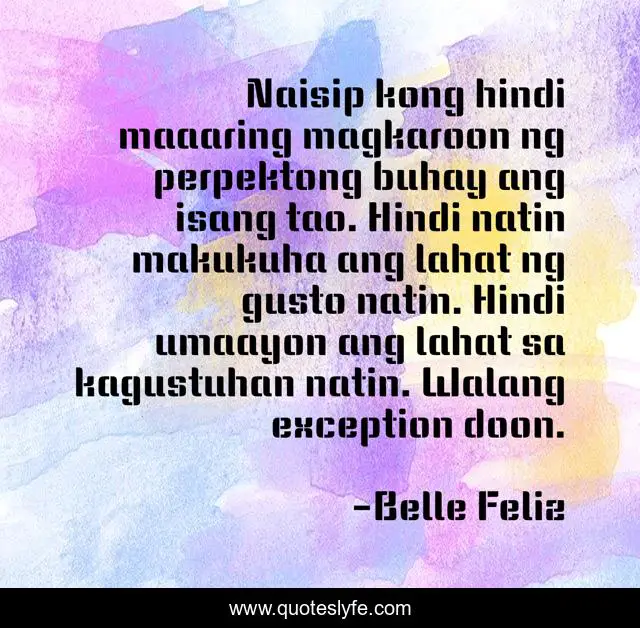 This page presents the quote "Naisip kong hindi maaaring magkaroon ng perpektong buhay ang isang tao. Hindi natin makukuha ang lahat ng gusto natin. Hindi umaayon ang lahat sa kagustuhan natin. Walang exception doon.". Author of this quote is Belle Feliz. This quote is about romance, always-and-forever,.