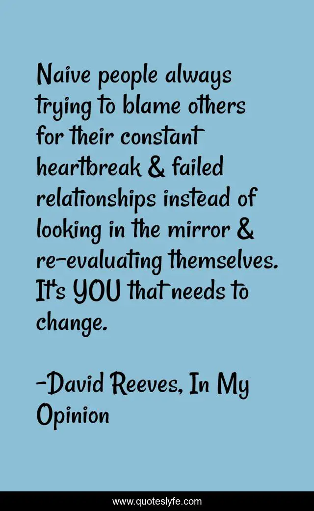 This page presents the quote "Naive people always trying to blame others for their constant heartbreak & failed relationships instead of looking in the mirror & re-evaluating themselves. It's YOU that needs to change.". Author of this quote is David Reeves, In My Opinion. This quote is about moving-forward, moving-on, self-improvement,.