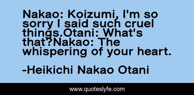 This page presents the quote "Nakao: Koizumi, I'm so sorry I said such cruel things.Otani: What's that?Nakao: The whispering of your heart.". Author of this quote is Heikichi Nakao Otani. This quote is about enthusiasm, forgive-me, forgiveness, inspirational,.