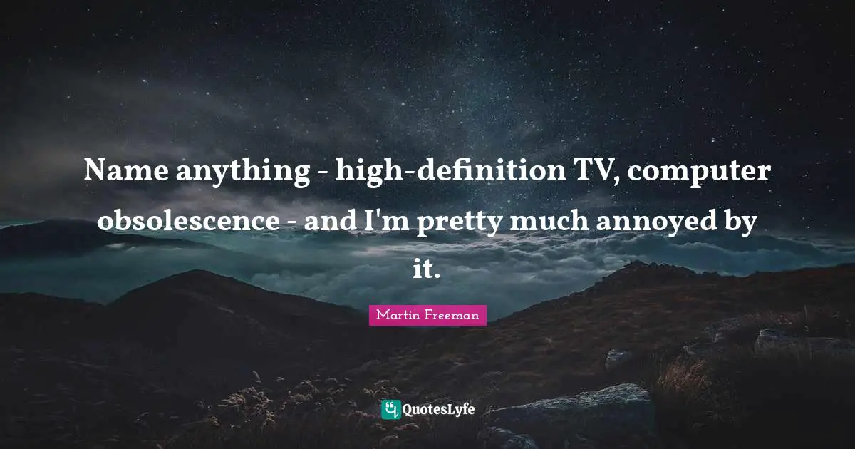 This page presents the quote "Name anything - high-definition TV, computer obsolescence - and I'm pretty much annoyed by it.". Author of this quote is Martin Freeman. This quote is about annoyed, definitions, names, computer, obsolescence,.