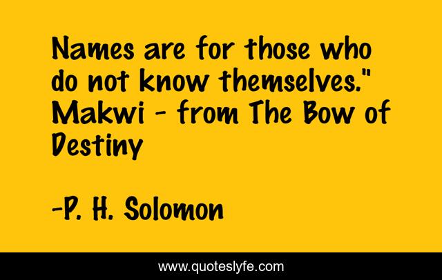 This page presents the quote "Names are for those who do not know themselves." Makwi - from The Bow of Destiny". Author of this quote is P. H. Solomon. This quote is about fantasy, fantasy-books, fantasy-fiction, fantasy-series,.