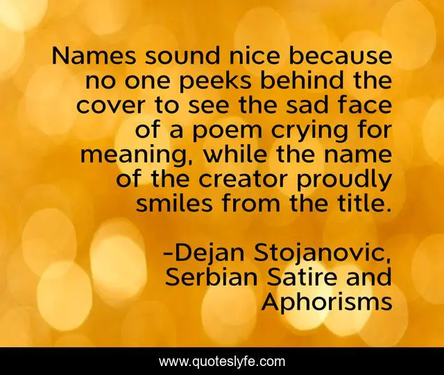 This page presents the quote "Names sound nice because no one peeks behind the cover to see the sad face of a poem crying for meaning, while the name of the creator proudly smiles from the title.". Author of this quote is Dejan Stojanovic, Serbian Satire and Aphorisms. This quote is about dejan-st, cover-pages, poets, names, poems,.