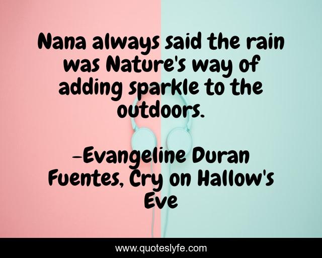 This page presents the quote "Nana always said the rain was Nature's way of adding sparkle to the outdoors.". Author of this quote is Evangeline Duran Fuentes, Cry on Hallow's Eve. This quote is about sparkle, rain, nature,.