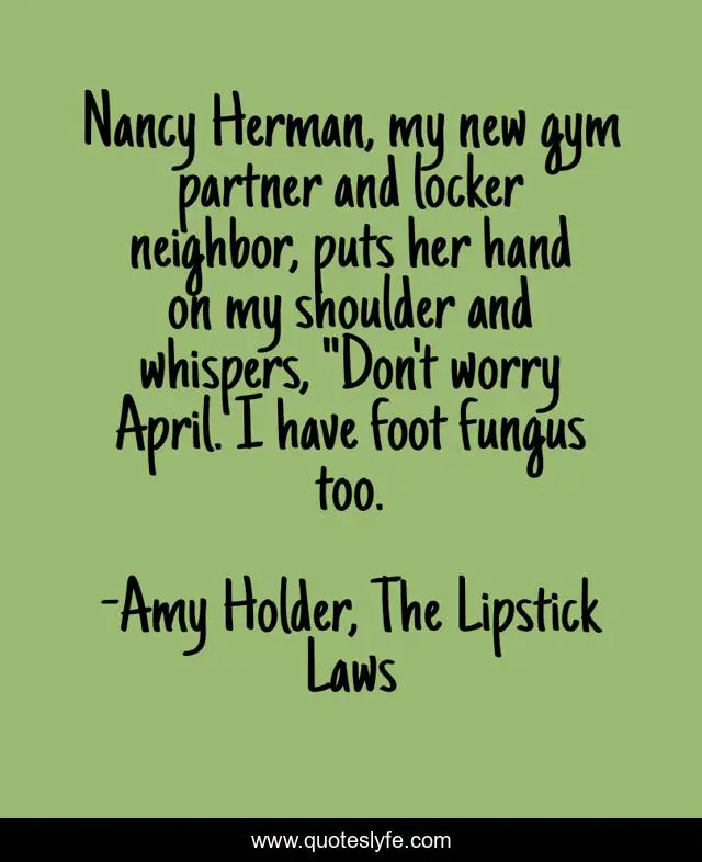 This page presents the quote "Nancy Herman, my new gym partner and locker neighbor, puts her hand on my shoulder and whispers, "Don't worry April. I have foot fungus too.". Author of this quote is Amy Holder, The Lipstick Laws. .