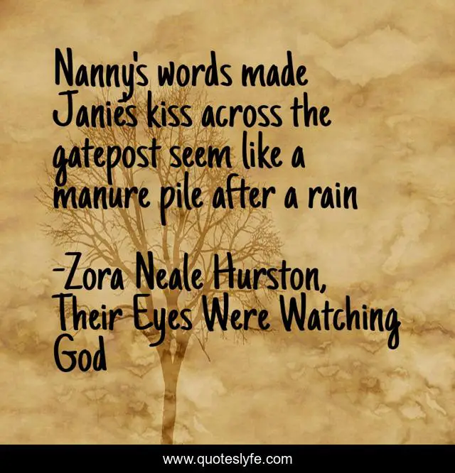 This page presents the quote "Nanny's words made Janie's kiss across the gatepost seem like a manure pile after a rain". Author of this quote is Zora Neale Hurston, Their Eyes Were Watching God. This quote is about simile, metaphor,.