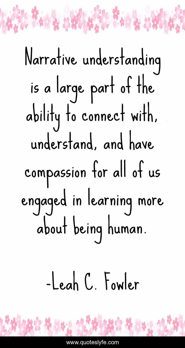 This page presents the quote "Narrative understanding is a large part of the ability to connect with, understand, and have compassion for all of us engaged in learning more about being human.". Author of this quote is Leah C. Fowler. This quote is about story-telling, education, narrative,.