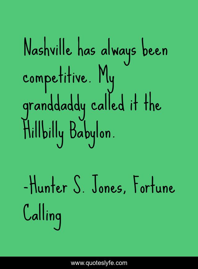 This page presents the quote "Nashville has always been competitive. My granddaddy called it the Hillbilly Babylon.". Author of this quote is Hunter S. Jones, Fortune Calling. This quote is about country-music, musicians, nashville, fiction,.