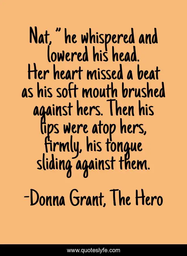 This page presents the quote "Nat, ” he whispered and lowered his head. Her heart missed a beat as his soft mouth brushed against hers. Then his lips were atop hers, firmly, his tongue sliding against them.". Author of this quote is Donna Grant, The Hero. This quote is about military-romantic-mystery, contemporary-romance,.