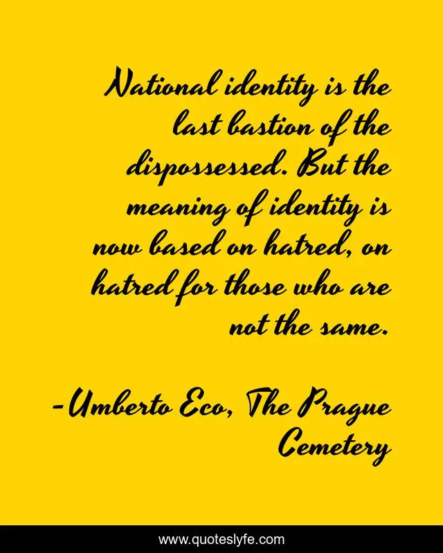 This page presents the quote "National identity is the last bastion of the dispossessed. But the meaning of identity is now based on hatred, on hatred for those who are not the same.". Author of this quote is Umberto Eco, The Prague Cemetery. This quote is about religion, nationalism, identity,.