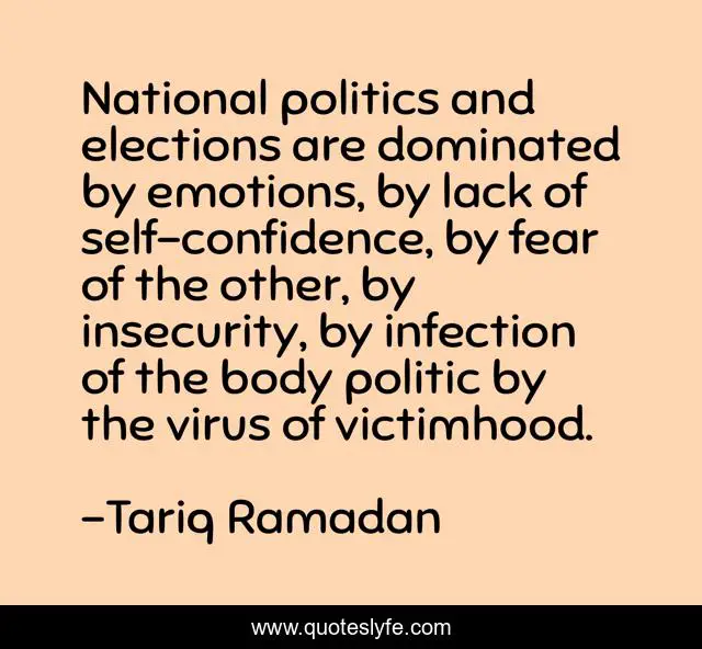 This page presents the quote "National politics and elections are dominated by emotions, by lack of self-confidence, by fear of the other, by insecurity, by infection of the body politic by the virus of victimhood.". Author of this quote is Tariq Ramadan. This quote is about politics, self-confidence,.