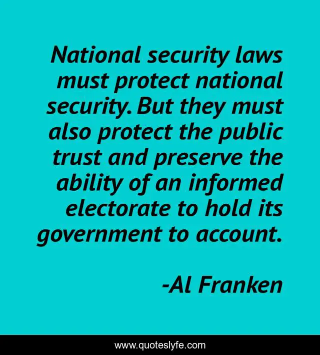 This page presents the quote "National security laws must protect national security. But they must also protect the public trust and preserve the ability of an informed electorate to hold its government to account.". Author of this quote is Al Franken. This quote is about security, government,.