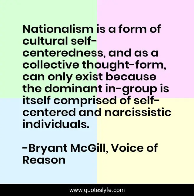 This page presents the quote "Nationalism is a form of cultural self-centeredness, and as a collective thought-form, can only exist because the dominant in-group is itself comprised of self-centered and narcissistic individuals.". Author of this quote is Bryant McGill, Voice of Reason. This quote is about aspirations, nationalism, patriotism,.
