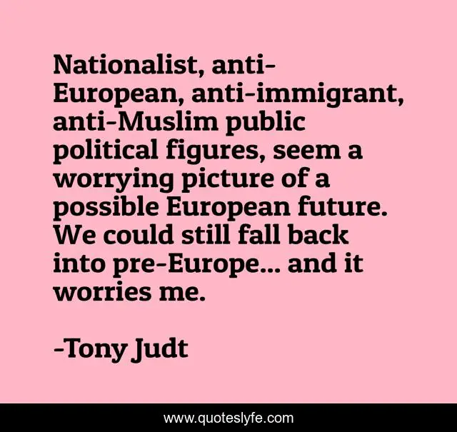 This page presents the quote "Nationalist, anti-European, anti-immigrant, anti-Muslim public political figures, seem a worrying picture of a possible European future. We could still fall back into pre-Europe... and it worries me.". Author of this quote is Tony Judt. This quote is about me, political, fall,.