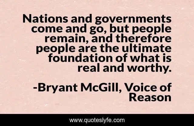 This page presents the quote "Nations and governments come and go, but people remain, and therefore people are the ultimate foundation of what is real and worthy.". Author of this quote is Bryant McGill, Voice of Reason. This quote is about nations, society, people, politics,.