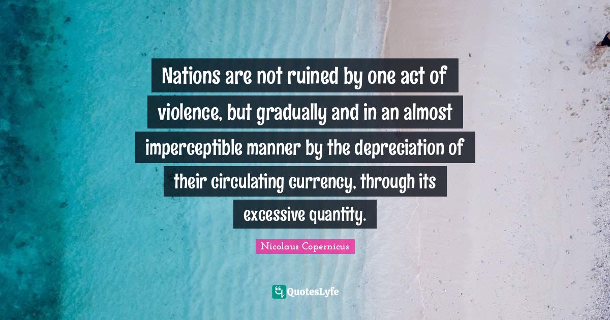 This page presents the quote "Nations are not ruined by one act of violence, but gradually and in an almost imperceptible manner by the depreciation of their circulating currency, through its excessive quantity.". Author of this quote is Nicolaus Copernicus. This quote is about libertarian, nations, currency, quantity, ruined, violence,.