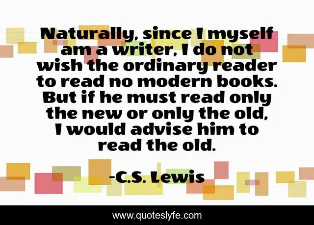 This page presents the quote "Naturally, since I myself am a writer, I do not wish the ordinary reader to read no modern books. But if he must read only the new or only the old, I would advise him to read the old.". Author of this quote is C.S. Lewis. This quote is about literary, books, reading, reading-habits,.