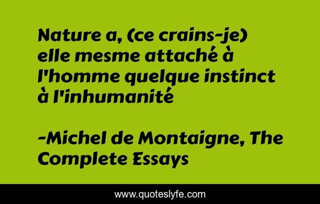 This page presents the quote "Nature a, (ce crains-je) elle mesme attaché à l'homme quelque instinct à l'inhumanité". Author of this quote is Michel de Montaigne, The Complete Essays. This quote is about essay, renaissance, skepticism, philosophy, french,.