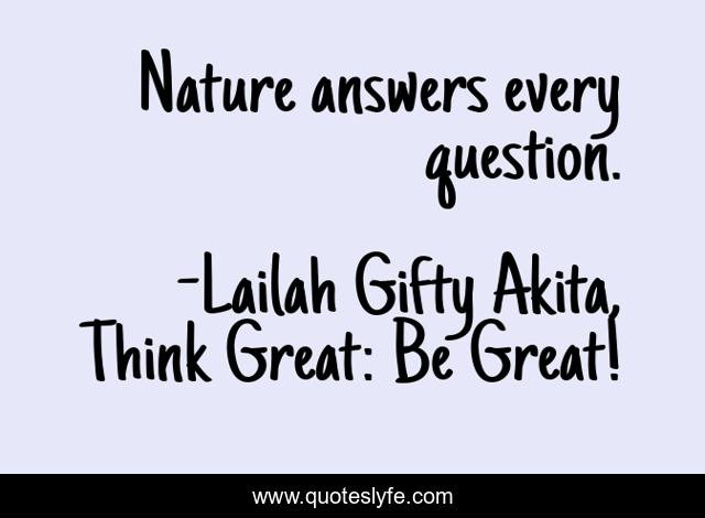 "Lailah Gifty Akita, Think Great: Be Great! Quotes." Quoteslyfe.com, 2025. Fri. 05 Dec. 2025. <https://www.quoteslyfe.com/quote/Nature-answers-every-question-218262>.