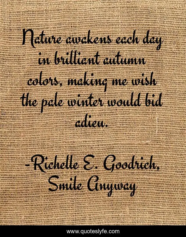 This page presents the quote "Nature awakens each day in brilliant autumn colors, making me wish the pale winter would bid adieu.". Author of this quote is Richelle E. Goodrich, Smile Anyway. This quote is about winter, nature, color, morning, richelle, richelle-goodrich, sunrise,.