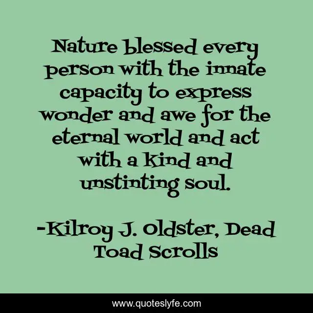 This page presents the quote "Nature blessed every person with the innate capacity to express wonder and awe for the eternal world and act with a kind and unstinting soul.". Author of this quote is Kilroy J. Oldster, Dead Toad Scrolls. This quote is about beauty-in-nature, kind-soul, kind-spirit, enlightenment-principles, magnanimous, kindness,.