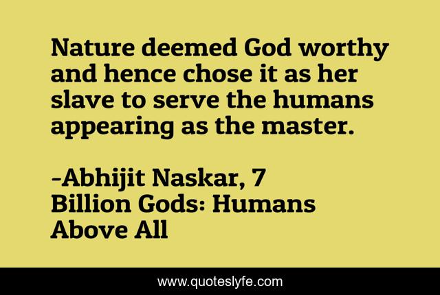 This page presents the quote "Nature deemed God worthy and hence chose it as her slave to serve the humans appearing as the master.". Author of this quote is Abhijit Naskar, 7 Billion Gods: Humans Above All. This quote is about brainy, divinity, god, psychology-of-religion, brainythinker, evolutionary-biology, natural-selection, evolutionary-psychology, mother-nature,.