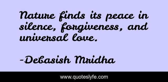 This page presents the quote "Nature finds its peace in silence, forgiveness, and universal love.". Author of this quote is Debasish Mridha. This quote is about peace, nature, philosophy, debasish-mridha, quotes, debasish-mridha-md, inspirational, enthusiasm, universal-love,.