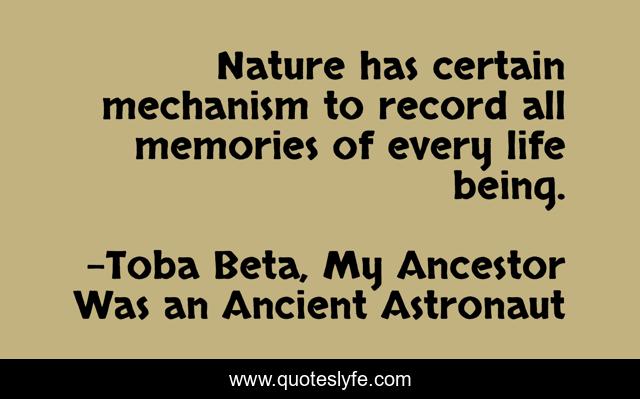 This page presents the quote "Nature has certain mechanism to record all memories of every life being.". Author of this quote is Toba Beta, My Ancestor Was an Ancient Astronaut. This quote is about entire, nature, universe, mechanism, record, memory,.