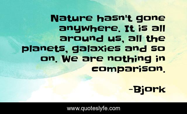 This page presents the quote "Nature hasn't gone anywhere. It is all around us, all the planets, galaxies and so on. We are nothing in comparison.". Author of this quote is Bjork. This quote is about nothing, comparison, gone,.
