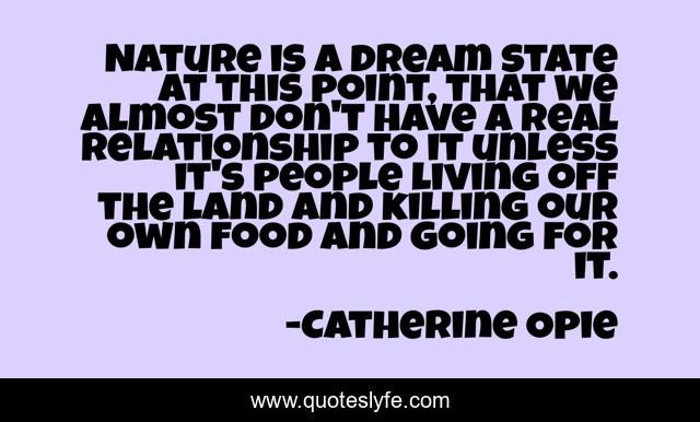 This page presents the quote "Nature is a dream state at this point, that we almost don't have a real relationship to it unless it's people living off the land and killing our own food and going for it.". Author of this quote is Catherine Opie. This quote is about food, nature, people,.