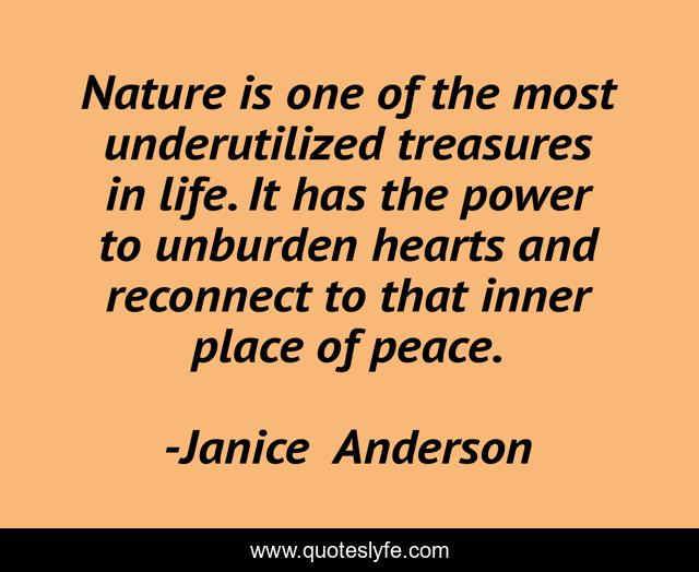 This page presents the quote "Nature is one of the most underutilized treasures in life. It has the power to unburden hearts and reconnect to that inner place of peace.". Author of this quote is Janice Anderson. This quote is about relationships, mountains, enlightenment, love, hiking, nature, forgiveness, mind-body-connection, peace,.