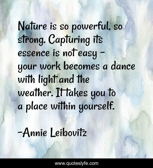This page presents the quote "Nature is so powerful, so strong. Capturing its essence is not easy - your work becomes a dance with light and the weather. It takes you to a place within yourself.". Author of this quote is Annie Leibovitz. This quote is about dance, light, work,.
