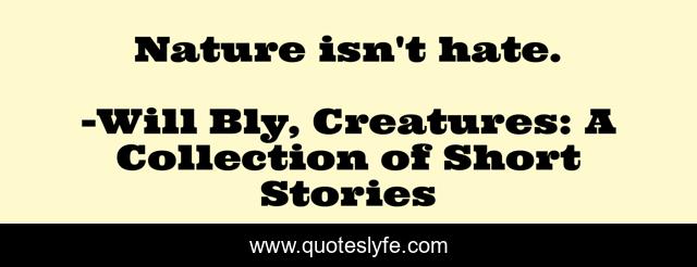 This page presents the quote "Nature isn't hate.". Author of this quote is Will Bly, Creatures: A Collection of Short Stories. This quote is about nature-of-things, creatures, bloody-bagel, hate, nature,.