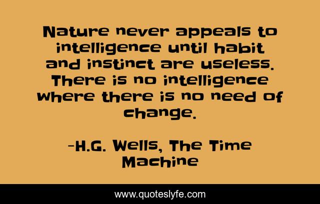 This page presents the quote "Nature never appeals to intelligence until habit and instinct are useless. There is no intelligence where there is no need of change.". Author of this quote is H.G. Wells, The Time Machine. This quote is about intelligence, science, human-nature,.