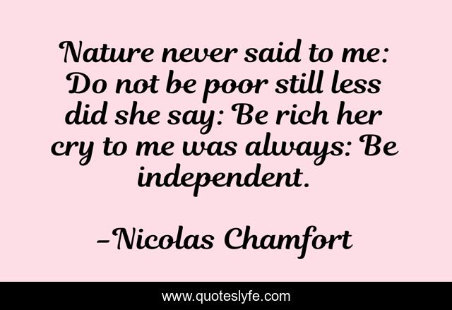 This page presents the quote "Nature never said to me: Do not be poor still less did she say: Be rich her cry to me was always: Be independent.". Author of this quote is Nicolas Chamfort. This quote is about me, rich, nature,.