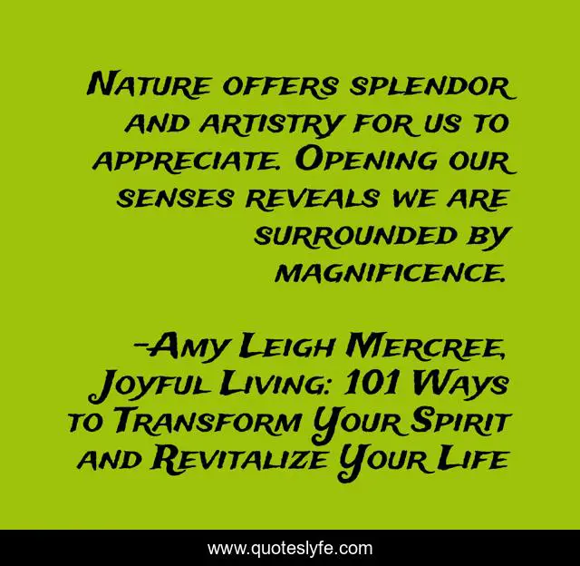 This page presents the quote "Nature offers splendor and artistry for us to appreciate. Opening our senses reveals we are surrounded by magnificence.". Author of this quote is Amy Leigh Mercree, Joyful Living: 101 Ways to Transform Your Spirit and Revitalize Your Life. This quote is about life, quotes-de-la-vida, amy-leigh-mercree, nature, quote-of-the-day, open-your-senses, joyful-living, quotes-tumblr, joyful-living-101,.